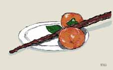 柿はあまり食べません。でも柿のオレンジ色が好きで、たわわに実る姿を見るととても嬉しくなります。 これは人から頂いたので、皿にのせて描いてみたもの。
