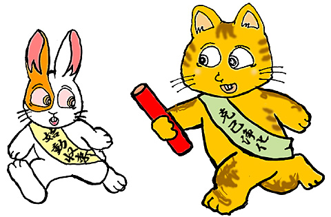 1999年の年賀状に入れたイラストです。手描きの線画をスキャンし着色。 その年のテーマをタスキに背負ったトラからうさぎへとバトンタッチ! …というものですが全然トラには見えませんね。