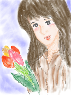 チューリップの花を手に満面の笑みの女性を描くつもりだったのですが、なんか複雑な表情に(^^;