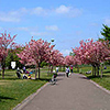 ピンクの濃い色の花をつける札幌の桜は、例年ほぼGW頃に咲く。本州では桜のことなど忘れ去った頃だ