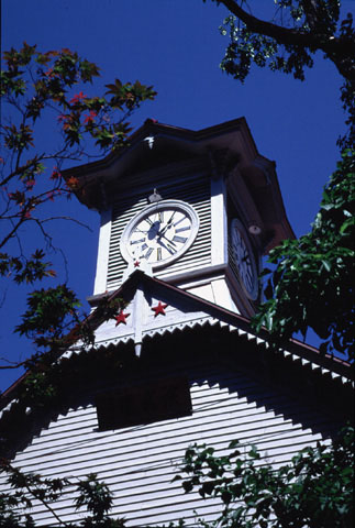 五月の青空に白い壁が映える札幌のシンボル「時計台」。長い工事も終わり、98年秋から開館した。